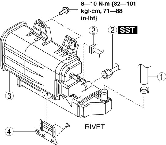 - The charcoal canister bracket is installed using rivets.