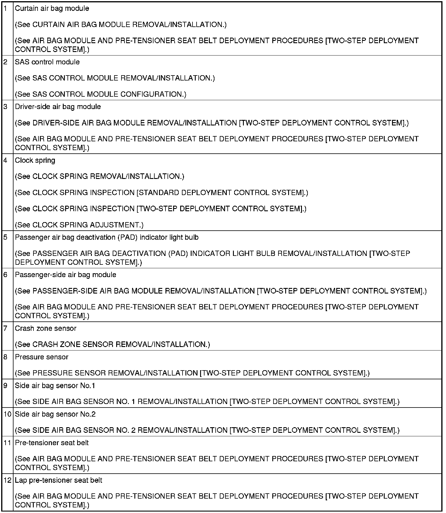 AIR BAG SYSTEM LOCATION INDEX [TWO-STEP DEPLOYMENT CONTROL SYSTEM]