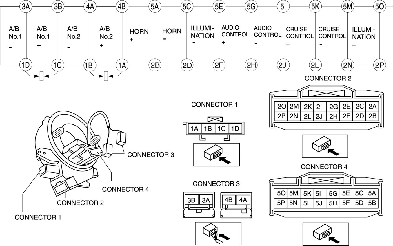 - When the vehicle-side connector for the clock spring is disconnected, terminals 1A, 1B, 1C and 1D are shorted to prevent unexpected operation (deployment) of the air bag module.