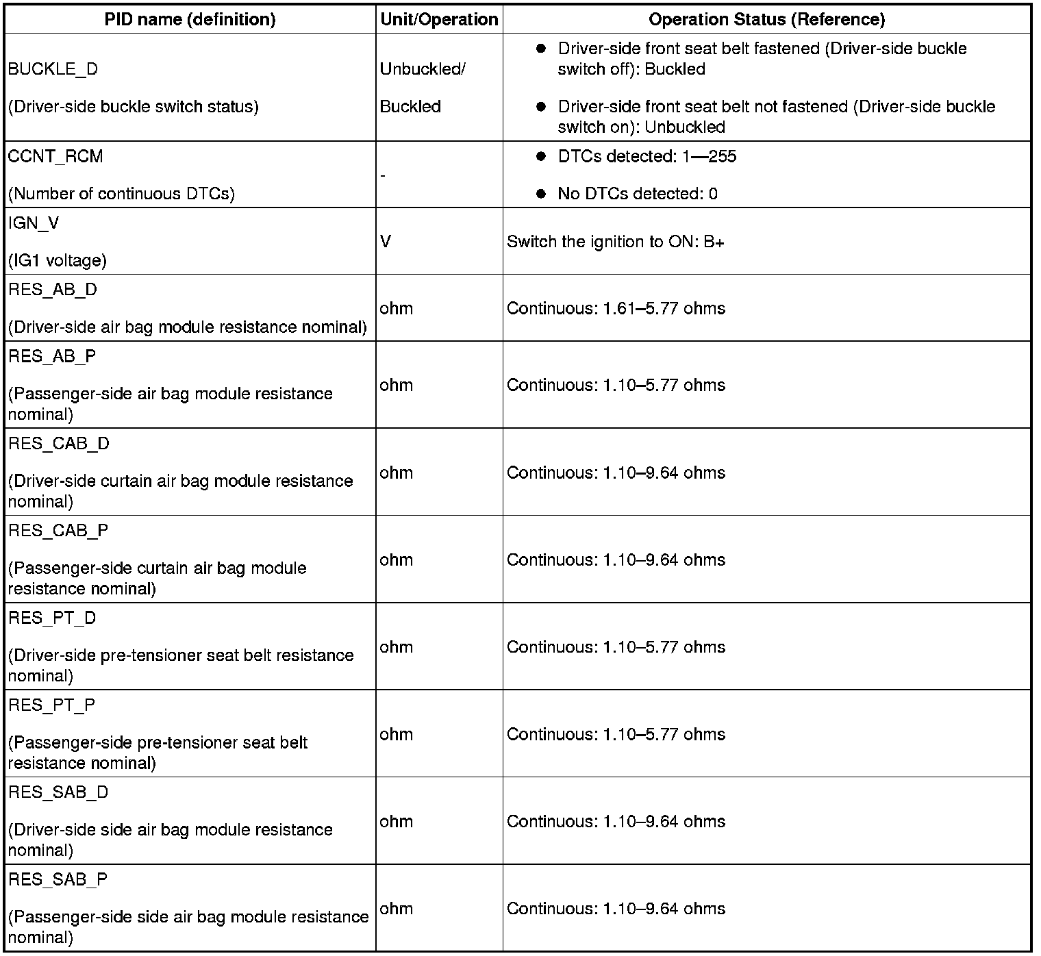 Pinout Values and Diagnostic Parameters