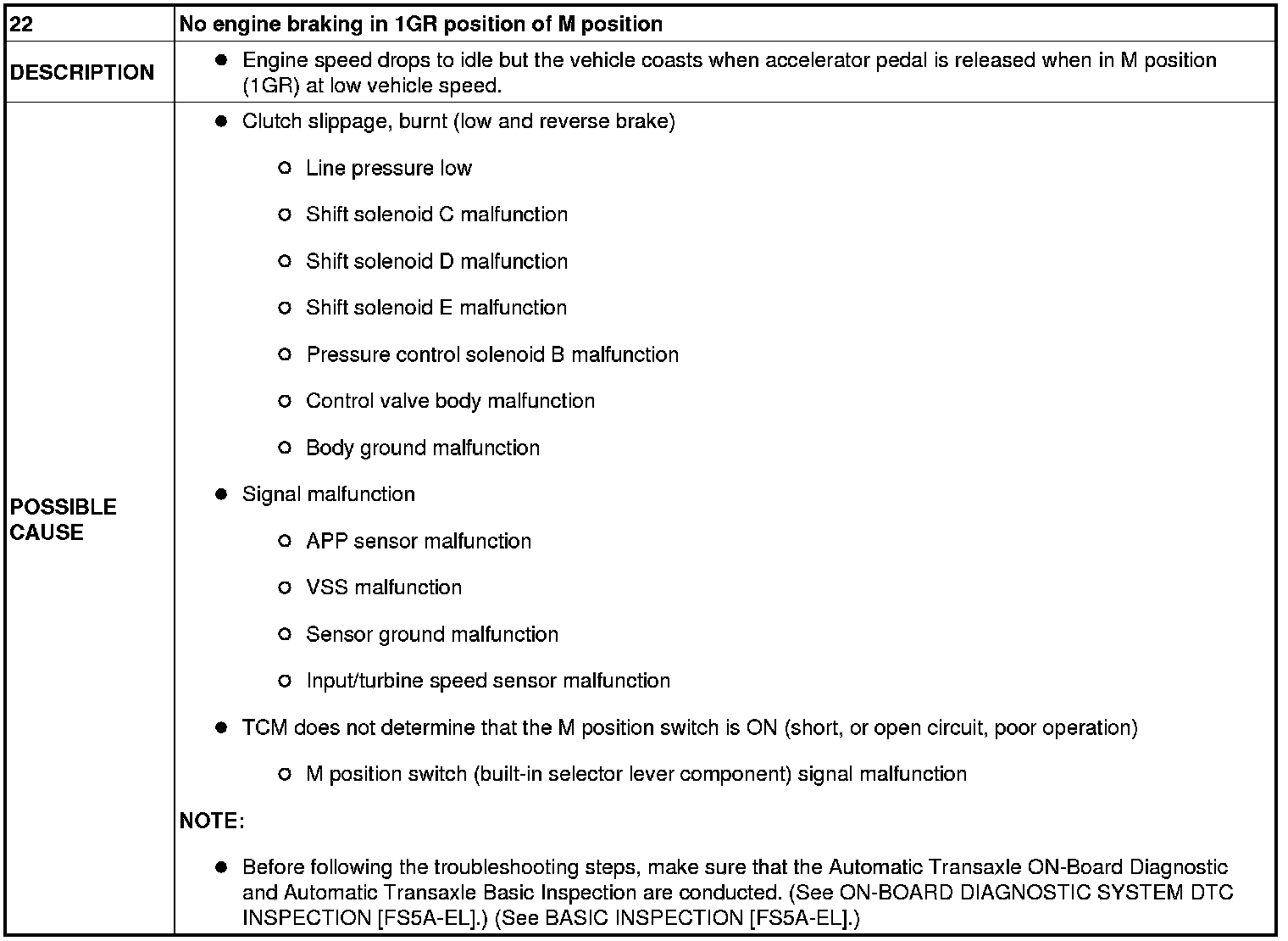 NO.22 NO ENGINE BRAKING IN 1GR POSITION OF M POSITION [FS5A-EL]