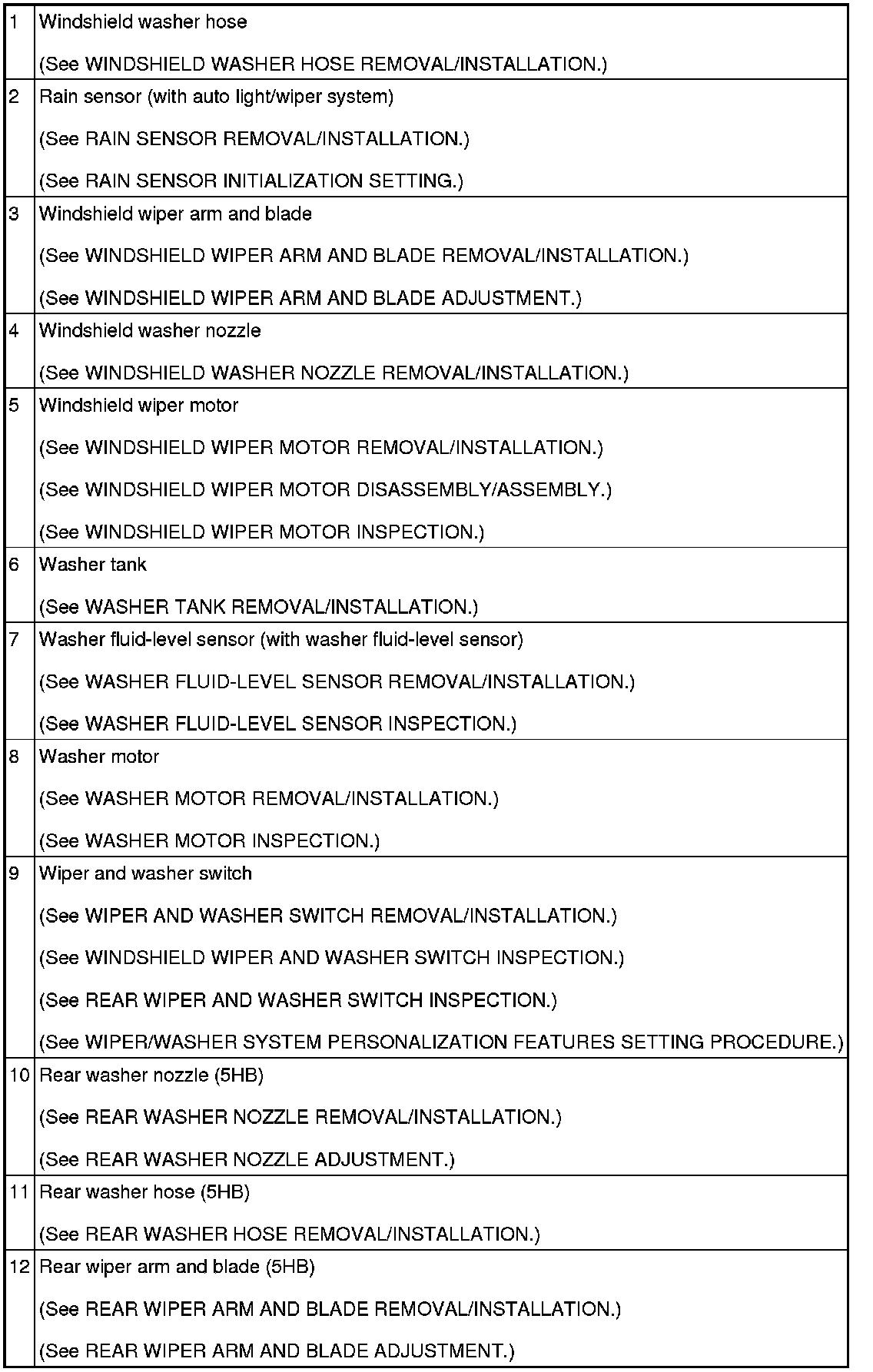 WIPER/WASHER SYSTEM LOCATION INDEX