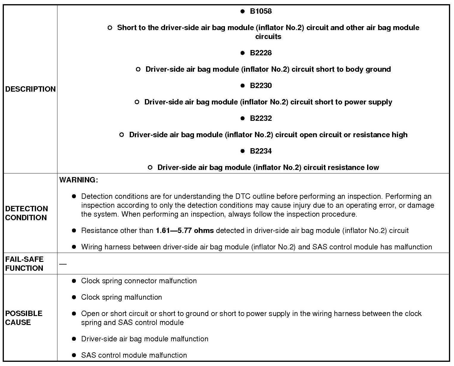 DTC B1058, B2228, B2230, B2232, B2234 [TWO-STEP DEPLOYMENT CONTROL SYSTEM]
