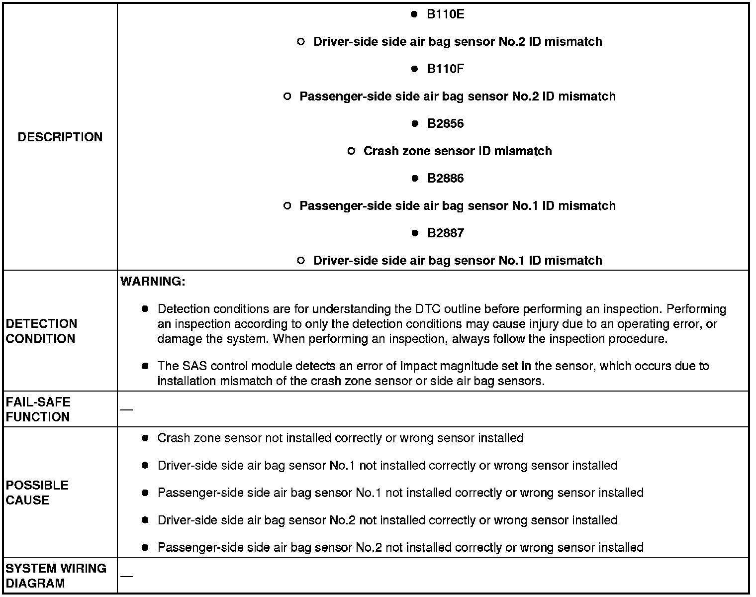 DTC B110E, B110F, B2856, B2886, B2887 [STANDARD DEPLOYMENT CONTROL SYSTEM]