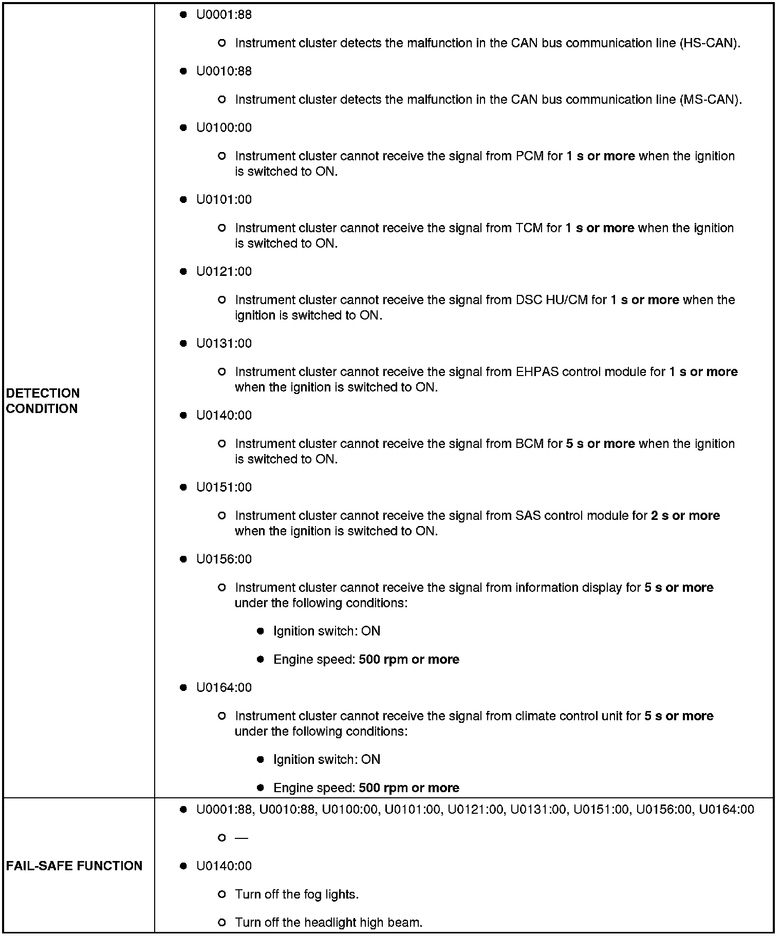 DTC U0001:88 / U0010:88 / U0100:00 / U0101:00 / U0121:00 / U0131:00 / U0140:00 / U0151:00 / U0156:00 / U0164:00 [INSTRUMENT CLUSTER]