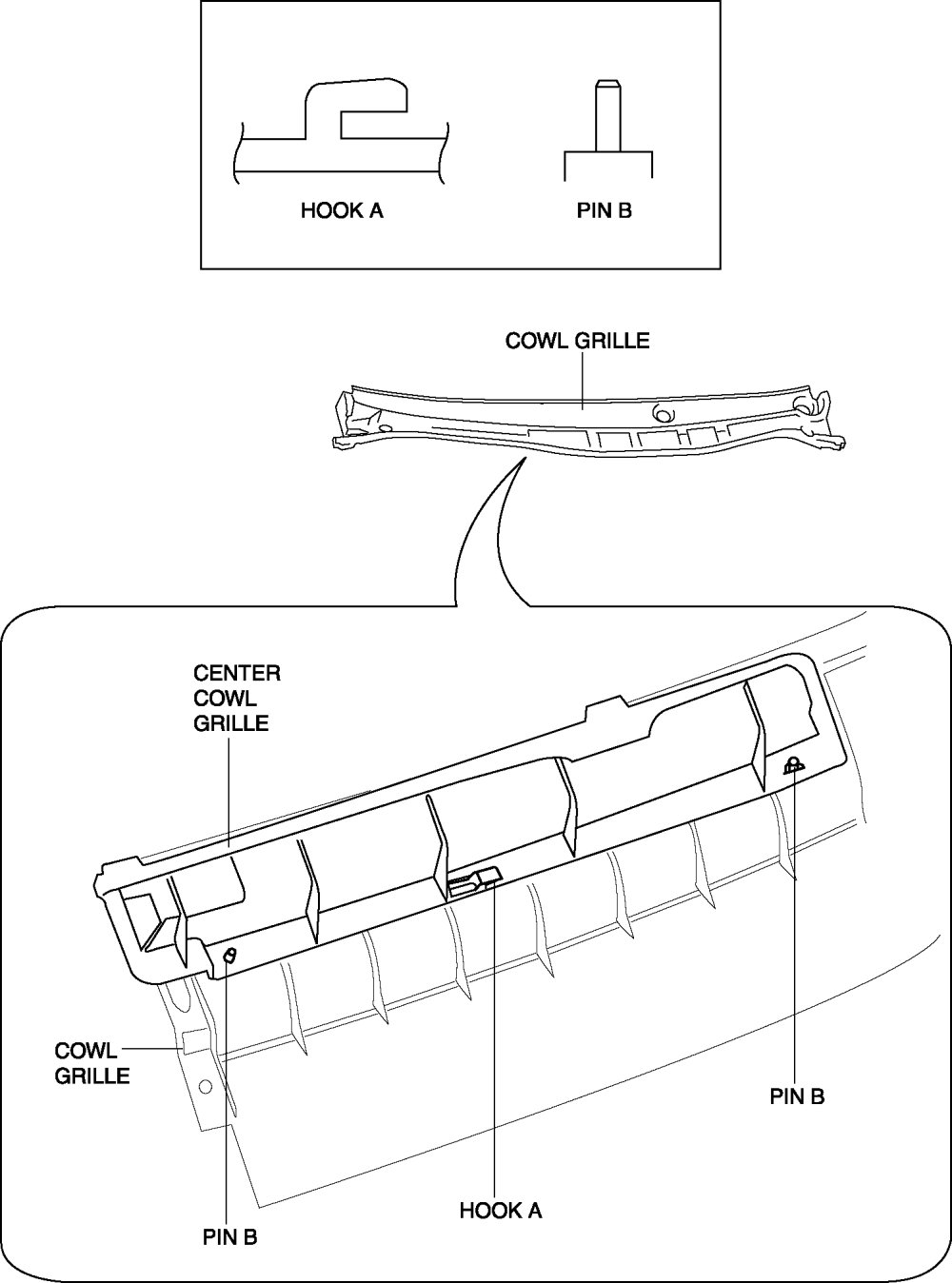 3. Remove the center cowl grille while detaching the hook A and pins B.