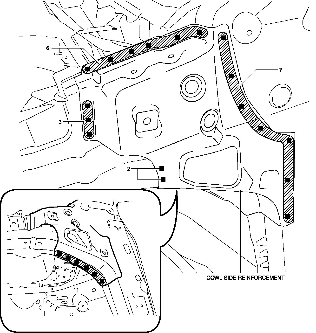 4. Plug weld the 29 locations indicated shown in the figure while install the cowl side reinforcement.
