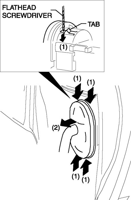 2. Press the tab in the direction of arrow (1) shown in the figure using a tape-wrapped flathead screwdriver, and remove the connector from the body in the direction of arrow (2) shown in the figure.
