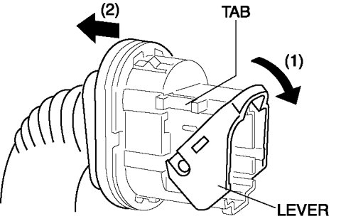 3. Lower the lever in the direction of arrow (1), and disconnect the connector in the direction of arrow (2).