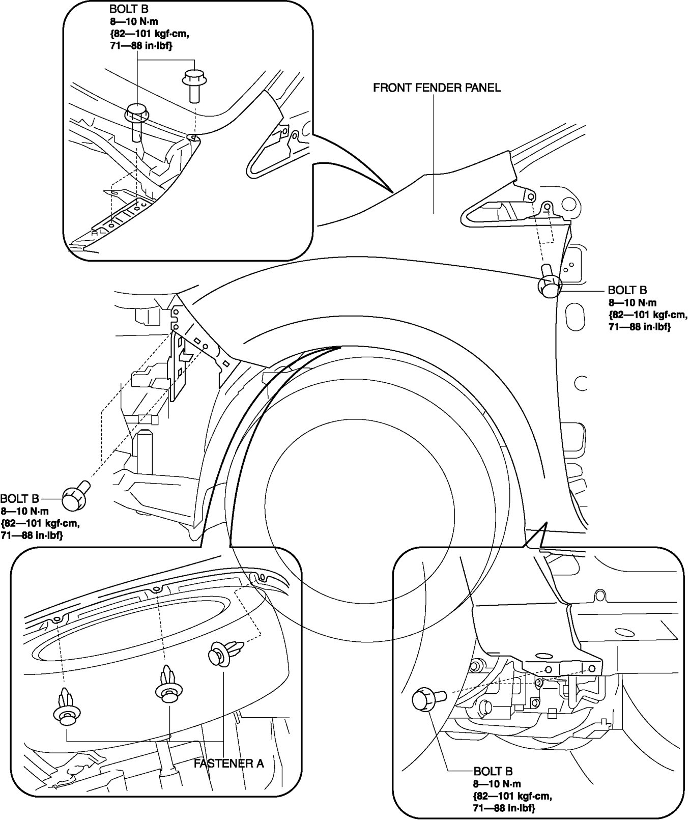3. Remove fastener A and bolt B, then remove the front fender panel.