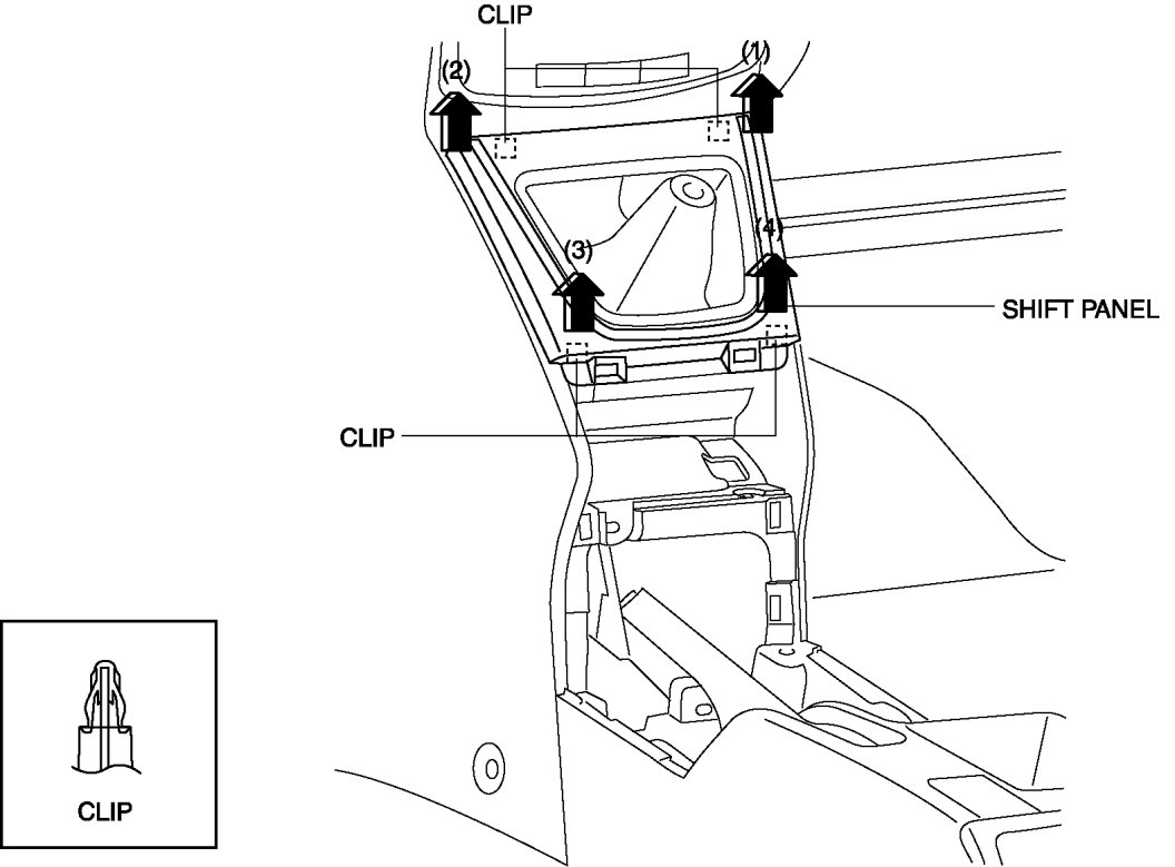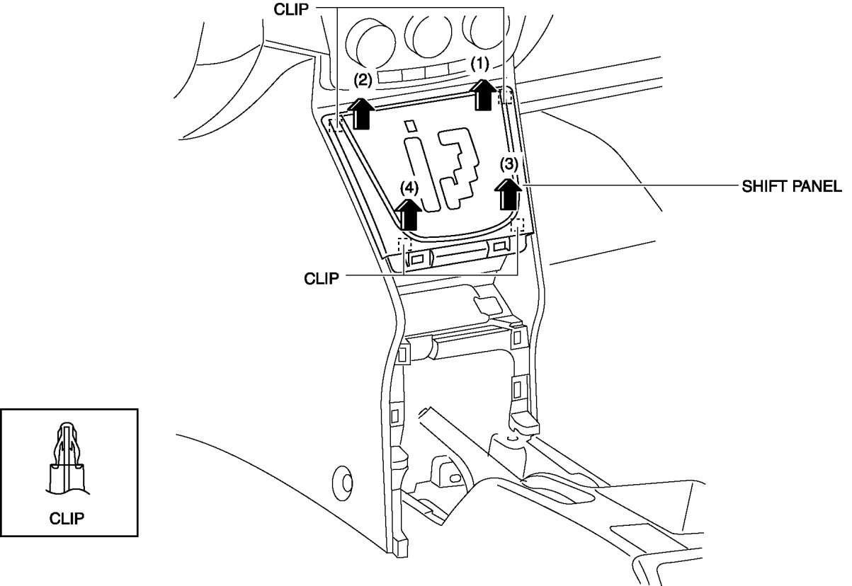 3. Pull the shift panel in the direction of the arrow (1), (2), (3), (4) while remove the clips.