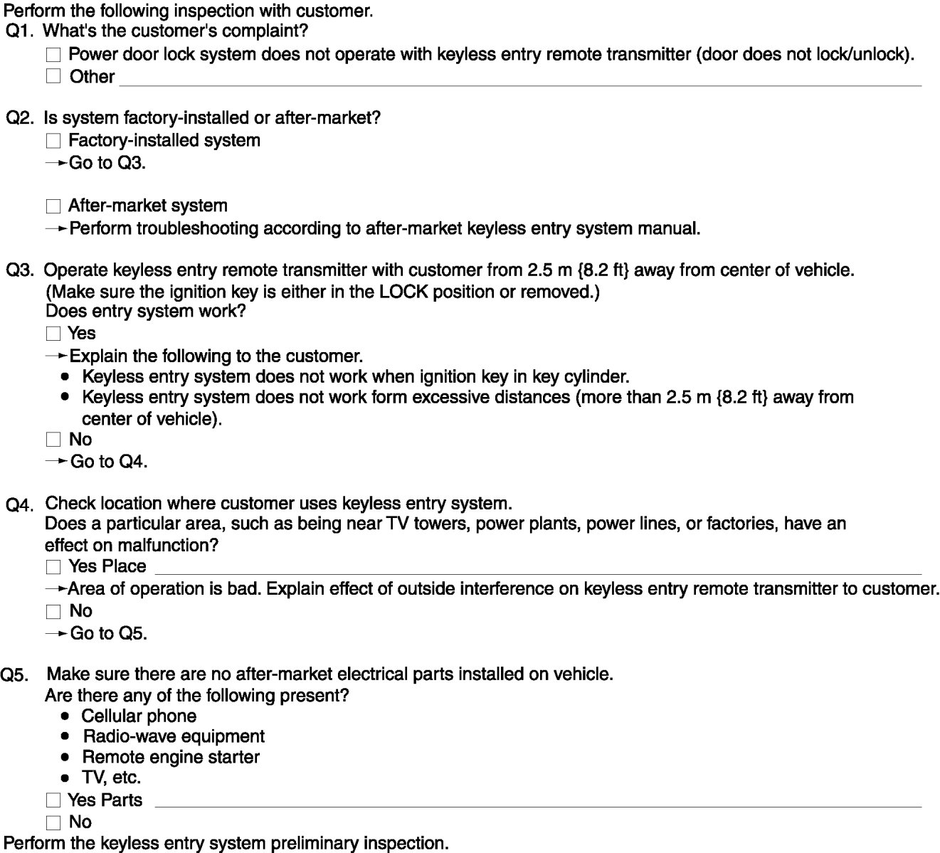 - If the symptom is "Power door lock system does not operate with keyless entry remote transmitter at all," find out how the customer uses the keyless entry system by following the check sheet below.