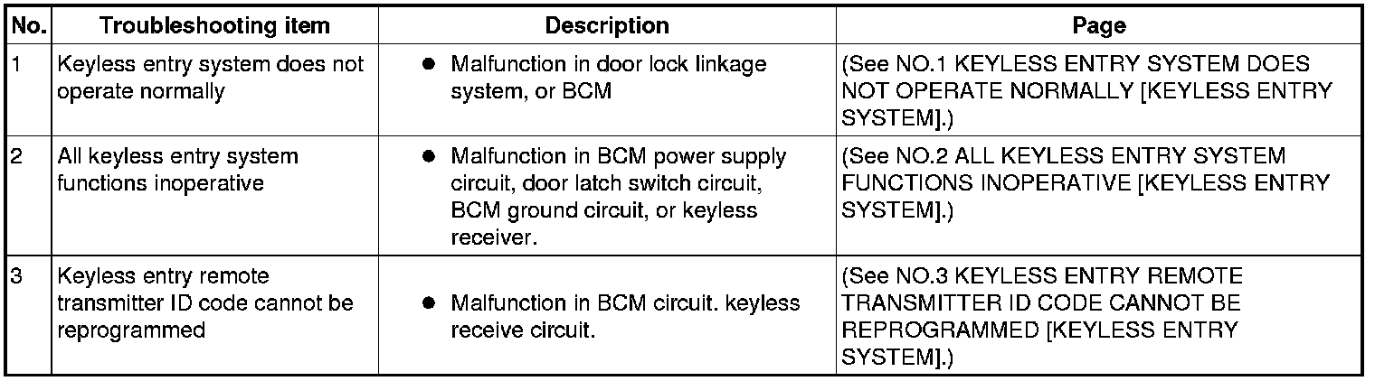 SYMPTOM TROUBLESHOOTING CHART [KEYLESS ENTRY SYSTEM]