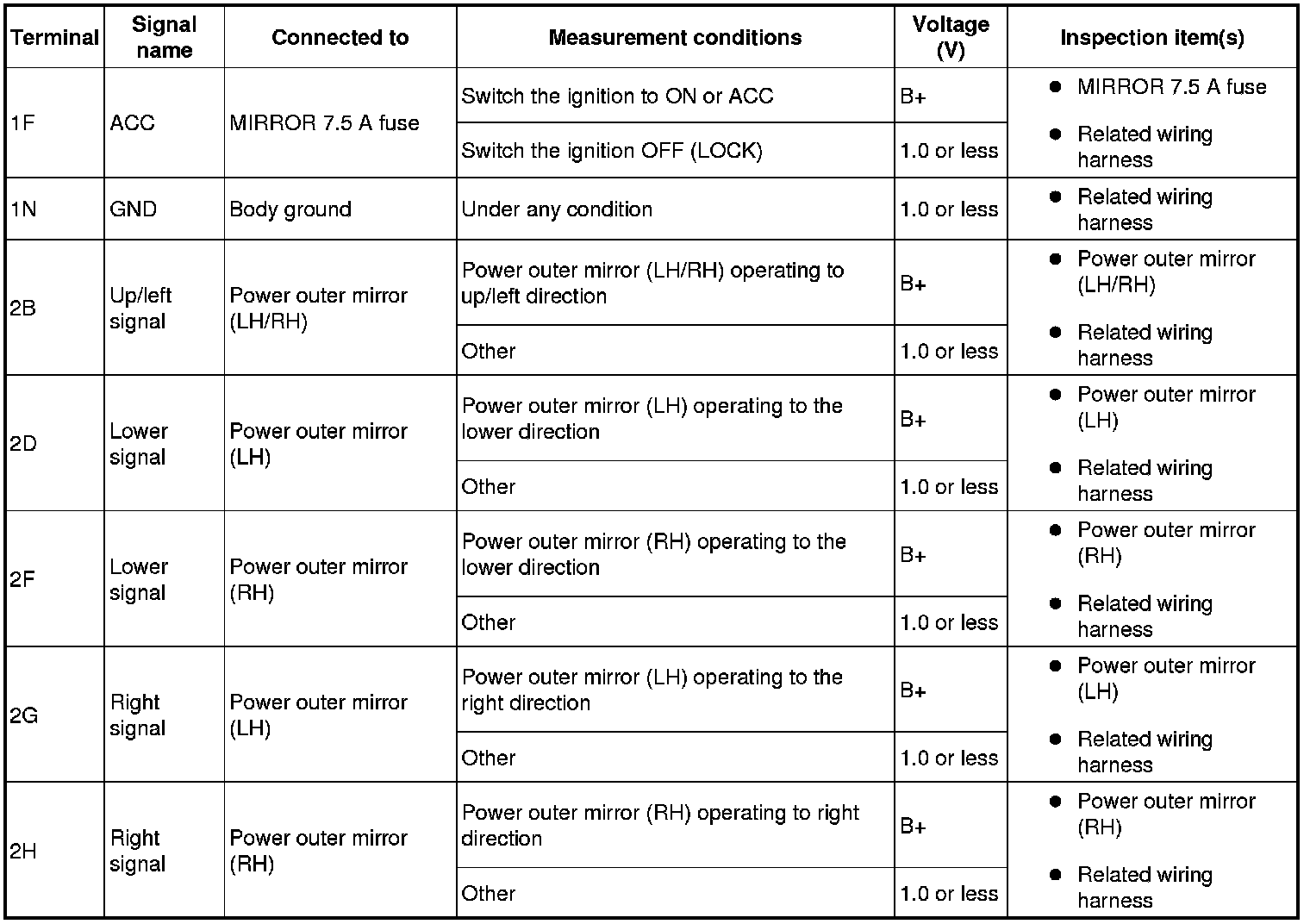 - If the voltage is not as specified in the terminal voltage table (reference), inspect the parts under Inspection item(s) and related wiring harnesses.