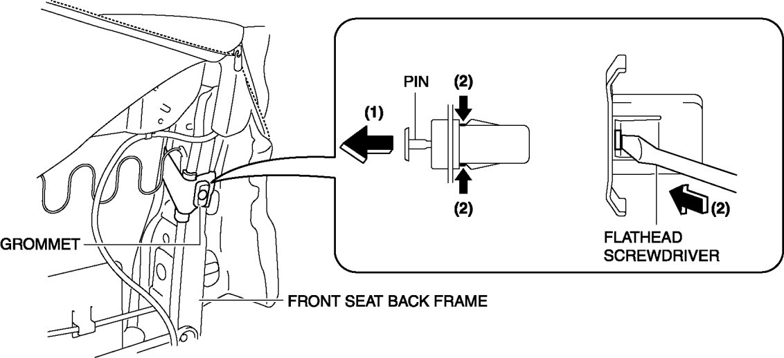 13. Pull the pin out in the direction of arrow (1), remove the grommet from the front seat back frame while pushing hook of side part with a flathead screwdriver in the direction of arrow (2).