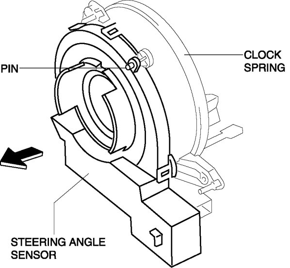 5. Pull the steering angle sensor in the direction of the arrow shown in the figure and remove the pin from the clock spring.