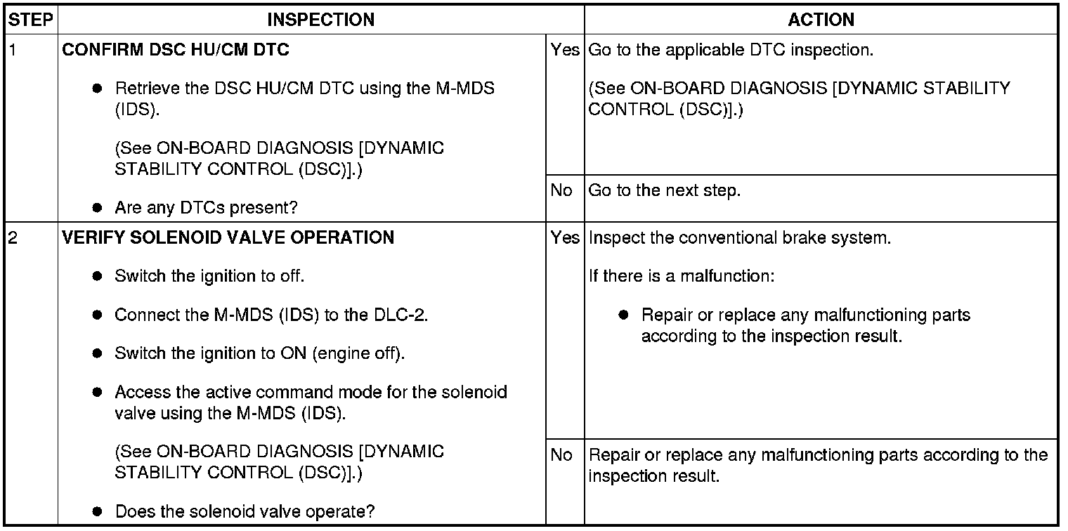 NO.3 THERE IS A MALFUNCTION IN THE SYSTEM EVEN THOUGH ABS WARNING LIGHT, BRAKE SYSTEM WARNING LIGHT, TCS/DSC INDICATOR LIGHT AND DSC OFF INDICATOR LIGHT DO NOT ILLUMINATE [DYNAMIC STABILITY CONTROL (DSC)]