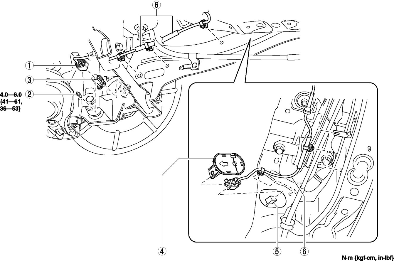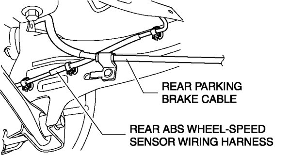 1. Pass the rear ABS wheel-speed sensor wiring harness outside the rear parking brake cable as shown in the figure.