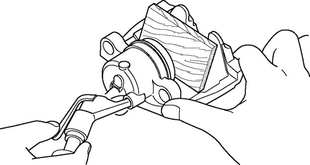 2. Insert a piece of wood between the caliper body and the piston, and while supporting the piston by hand, blow compressed air through the brake hose installation hole.