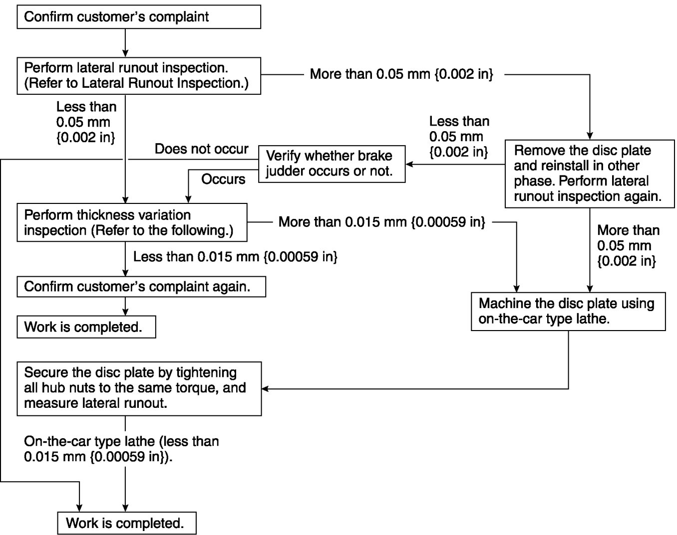 1. If the runout is more than 0.05 mm {0.002 in} at the position 10 mm {0.39 in} from the disc plate edge, uneven wear occurs on the disc plate because the pad contacts the plate unevenly.