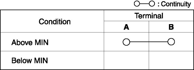 2. Inspect for continuity according to fluid level between the brake fluid level sensor terminals.