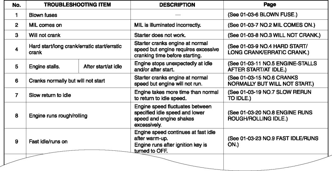 - The quick diagnosis chart lists diagnosis and inspection procedures to be performed specifically relating to the cause of the malfunction.