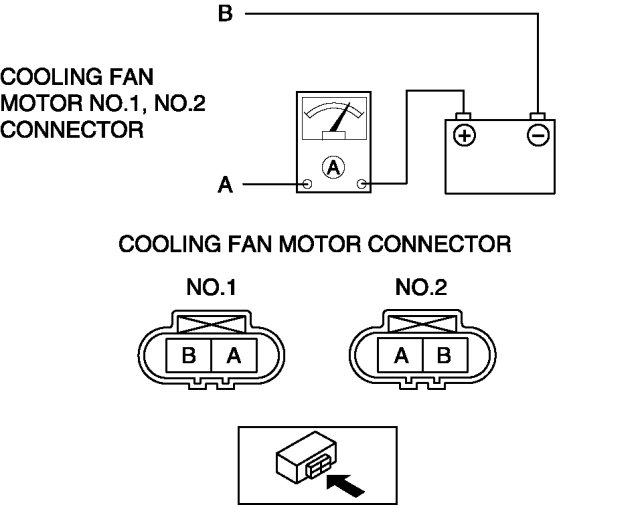 3. Install a tester and battery to the cooling fan motor connector (2 terminals) as shown in the figure.