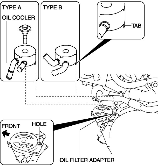 1. Align one of the positioning tabs on the oil cooler as shown in the figure to the oil filter adapter hole, and install the oil cooler.