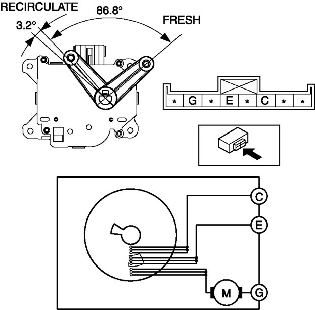1. Connect battery positive voltage to air intake actuator terminal C (or G), connect terminal G (or E) to ground, and then verify that the air intake actuator operates as shown in the table.