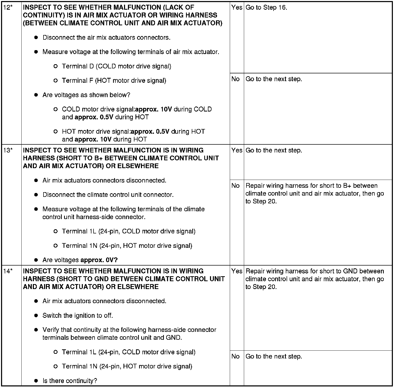 - When performing an asterisked (*) troubleshooting inspection, shake the wiring harness and connectors while performing the inspection to discover whether poor contact points are the cause of any intermittent malfunctions. If there is a problem, inspect to make sure connectors, terminals and wiring harnesses are connected correctly and undamaged.