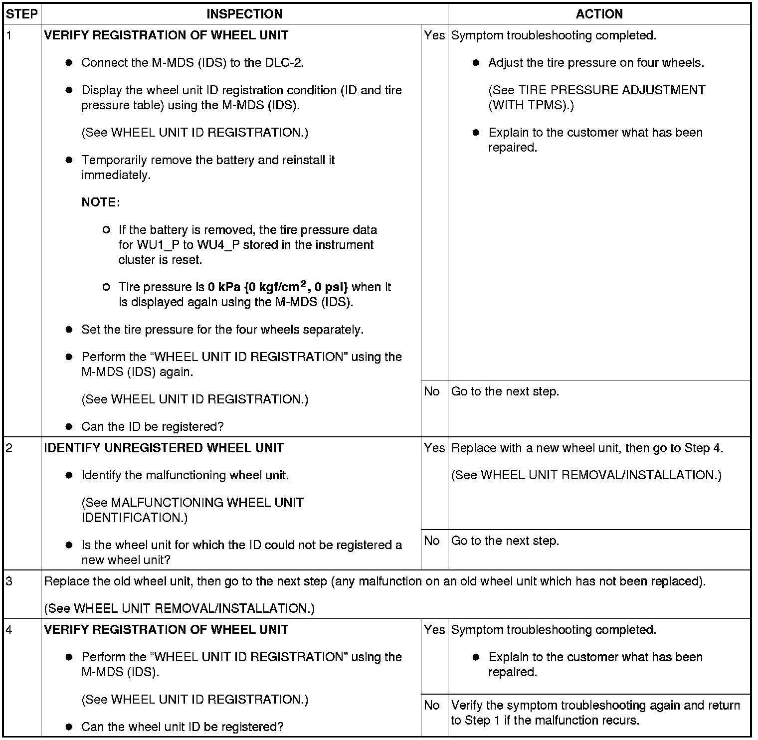 - Activate the wheel unit ID registration mode using the M-MDS (IDS), and perform the following steps if the tire pressure monitoring system warning light does not turn off after driving at 25 km/h {16 mph} or more for 10 min or more.