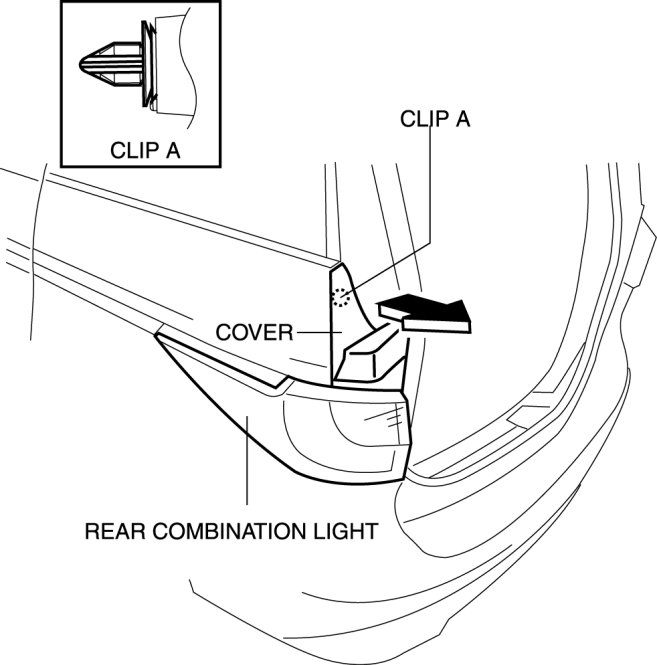 4. Pull the rear combination light in the direction of the arrow to detach the hook from clip B.