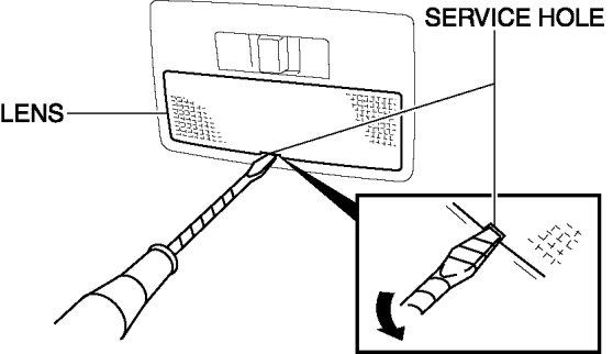 2. Insert a tape-wrapped flathead screwdriver into the service hole, push it in the direction indicated by the arrow, and then remove the lens.