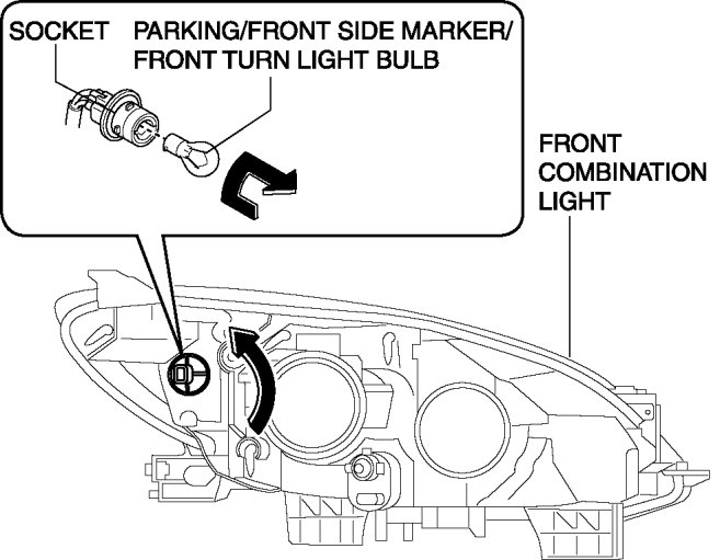 4. Rotate the parking/front side marker/front turn light bulb in the direction of the arrow shown in the figure to remove it from the socket.