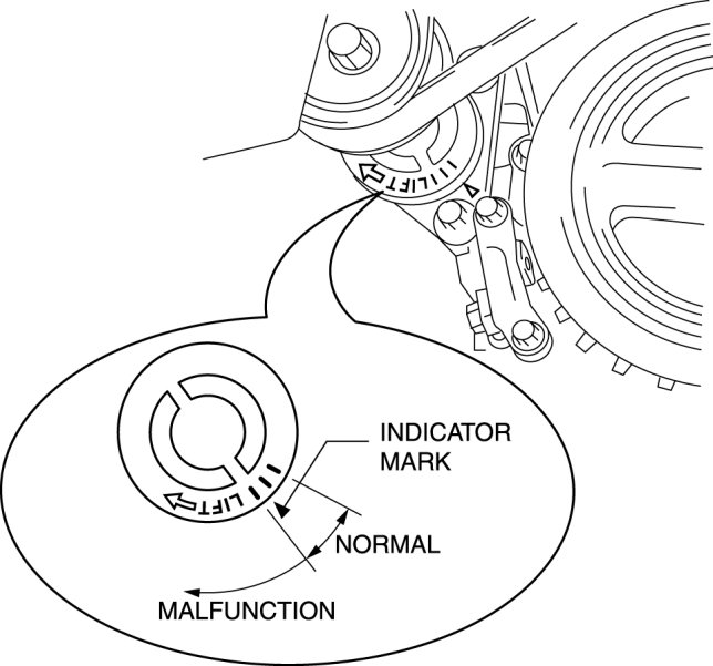 1. Verify that the drive belt auto tensioner indicator mark does not exceed the limit.