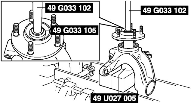 3. Tighten SST section A until the clearance between the bearing inner race and wheel hub component is 1-2 mm {0.04-0.07 in}.