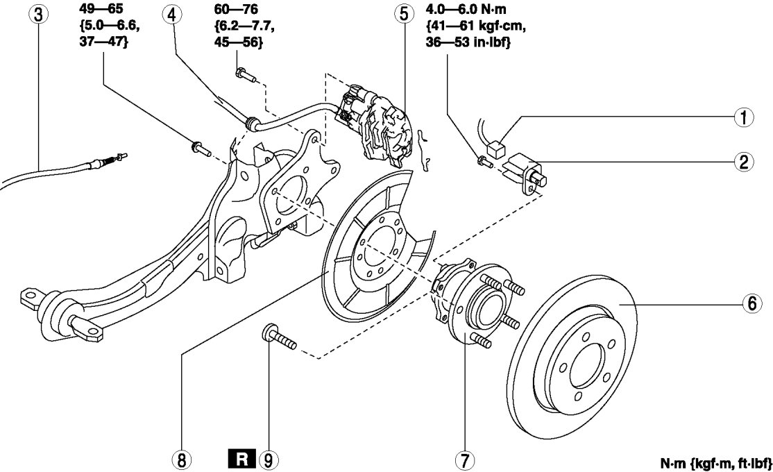 - Performing the following procedures without first removing the ABS wheel-speed sensor may possibly cause an open circuit in the wiring harness if it is pulled by mistake. Before performing the following procedures, disconnect the ABS wheel-speed sensor connector (body side) and fix the wiring harness to an appropriate place where it will not be pulled by mistake while servicing the vehicle.