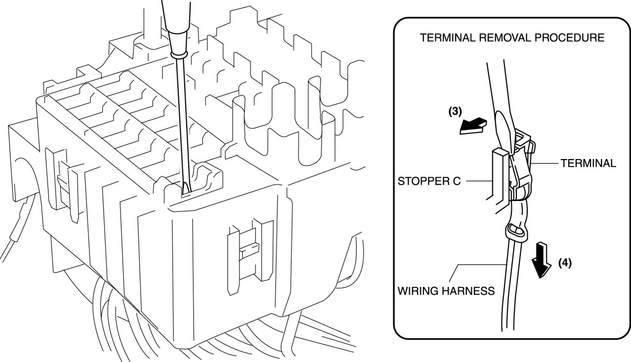 3. Move the flathead screwdriver in the direction of the arrow (3) shown in the figure, release stopper C, pull the wiring harness in the direction of the arrow (4), and then remove the terminal from the relay and fuse block.