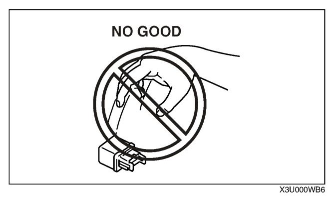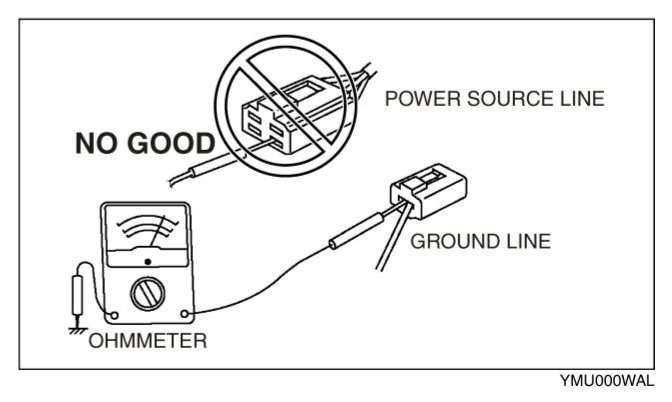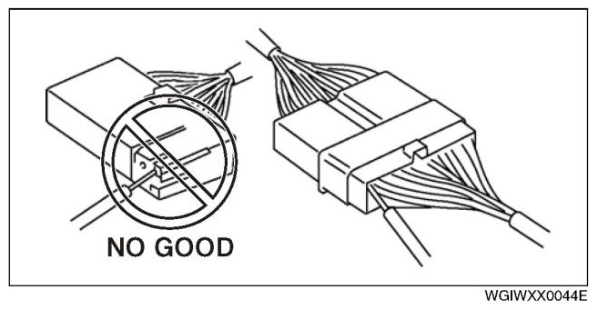 - When a tester is used to inspect for continuity or measuring voltage, insert the tester probe from the wiring harness side.