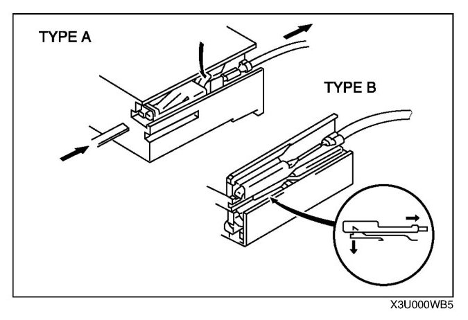 - Use the appropriate tools to remove a terminal as shown. When installing a terminal, be sure to insert it until it locks securely.