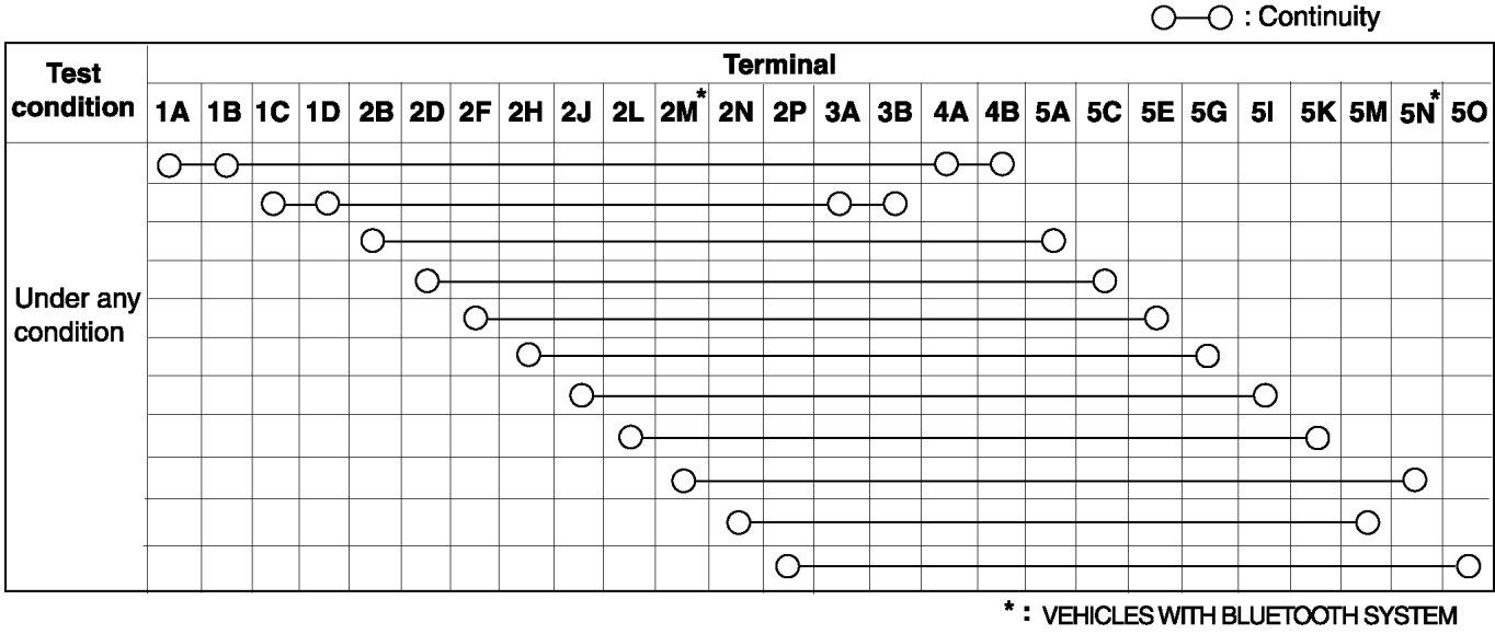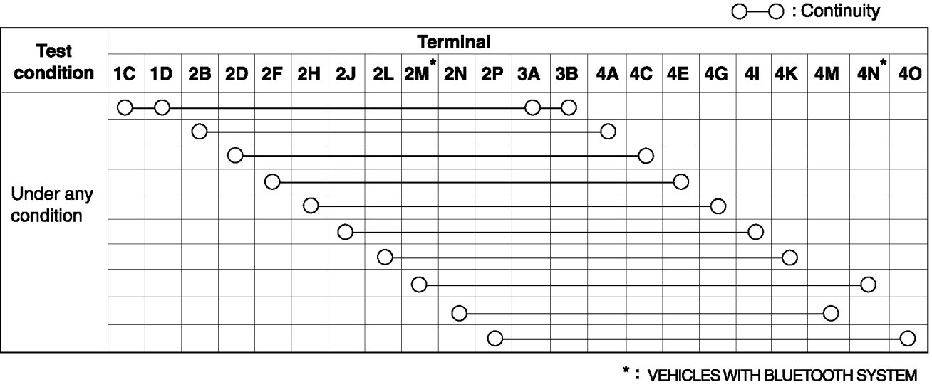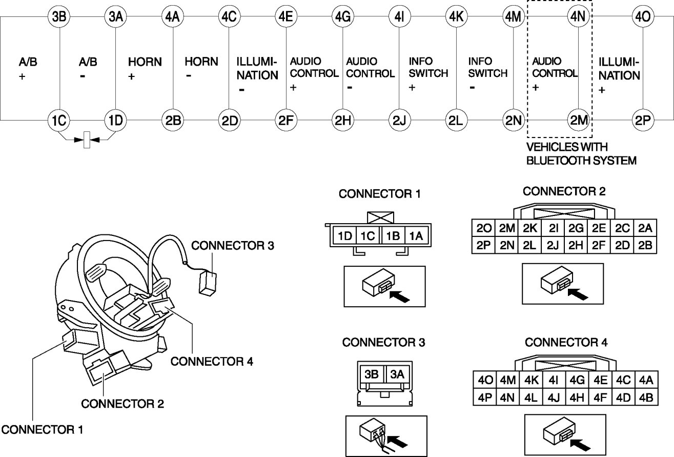 - When the vehicle-side connector for the clock spring is disconnected, terminals 1C and 1D are shorted to prevent unexpected operation (deployment) of the air bag module.