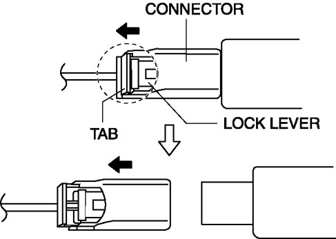 6. Disconnect the connector from the crash zone sensor by pressing the connector tab and pulling out the lock lever in the direction of the arrow.