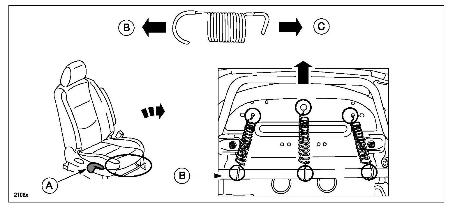 2. Install three (3) springs to the back of the seat cushion seat pan (C) and pipe frame (B).
