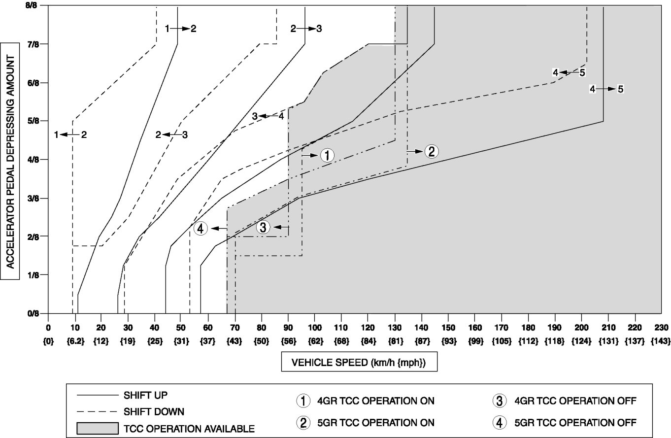 a. Verify that the gears shift from 1GR to 2GR, 2GR to 3GR, 3GR to 4GR, and 4GR to 5GR after depressing the accelerator pedal. In addition, verify that the vehicle speed corresponds to the shift point when shifting.