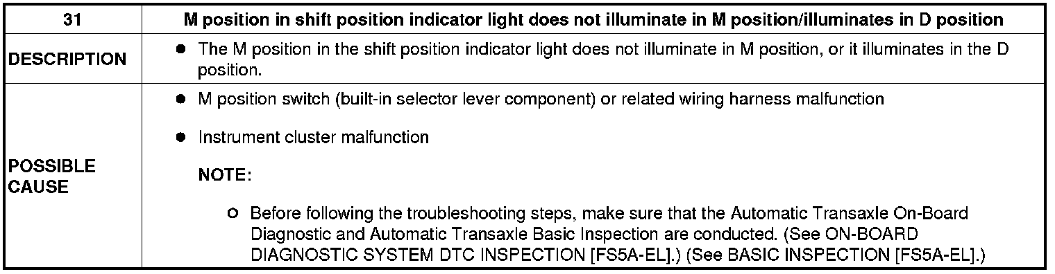 NO.31 M POSITION IN SHIFT POSITION INDICATOR LIGHT DOES NOT ILLUMINATE IN M POSITION/ILLUMINATES IN D POSITION [FS5A-EL]