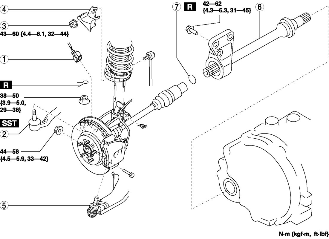 - 42-62 Nm {4.3-6.3 kgf-m, 31-45 ft-lbf}