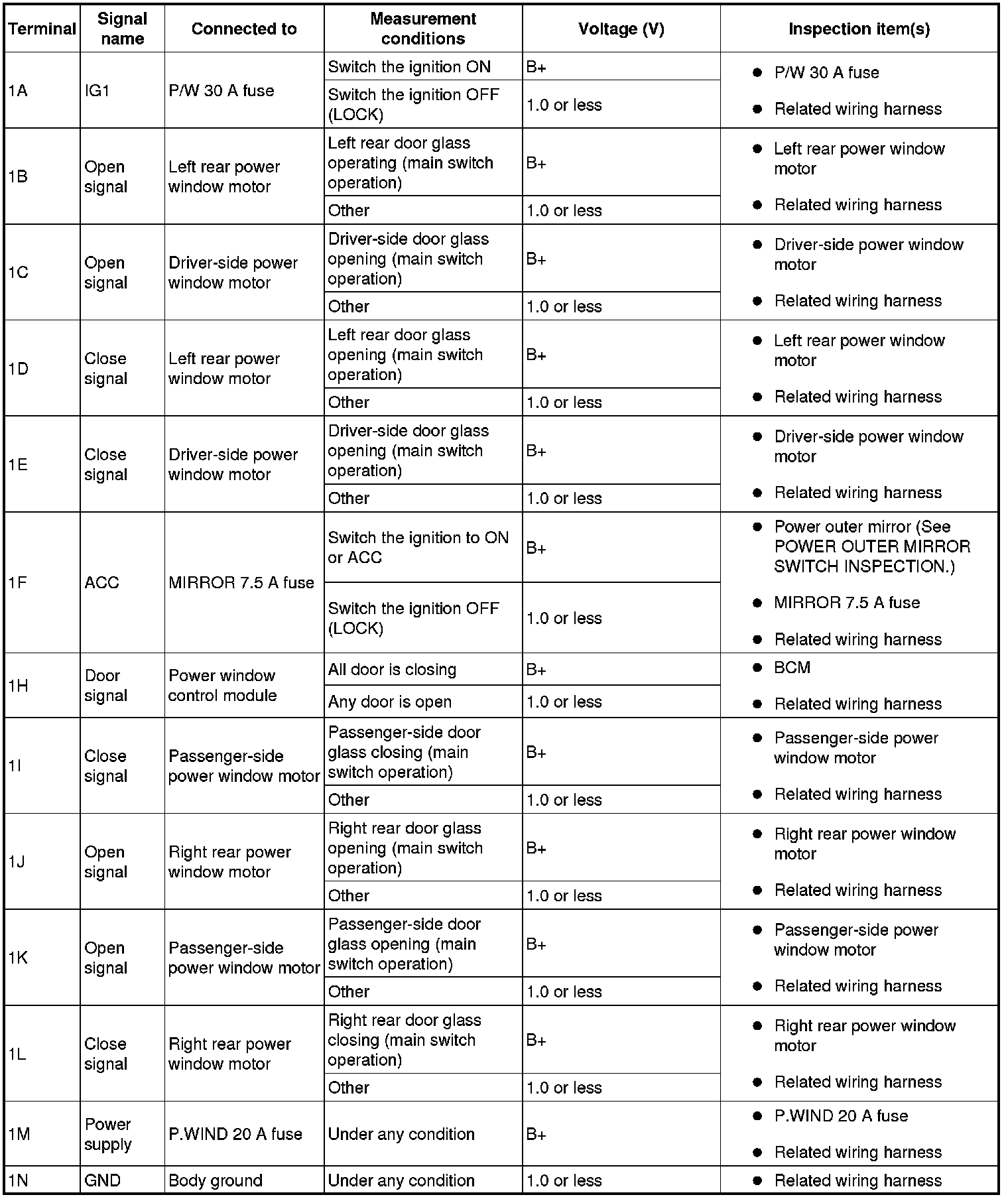 - If the voltage is not as specified in the terminal voltage table (reference), inspect the parts under Inspection item(s) and related wiring harnesses.