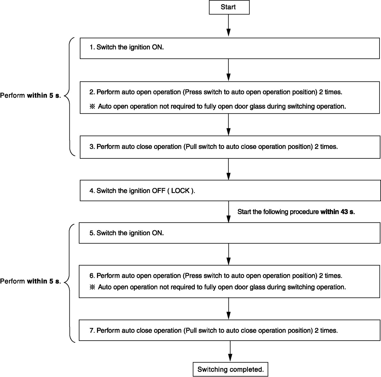For the following switching procedures, operate the power window main switch on the driver side.
