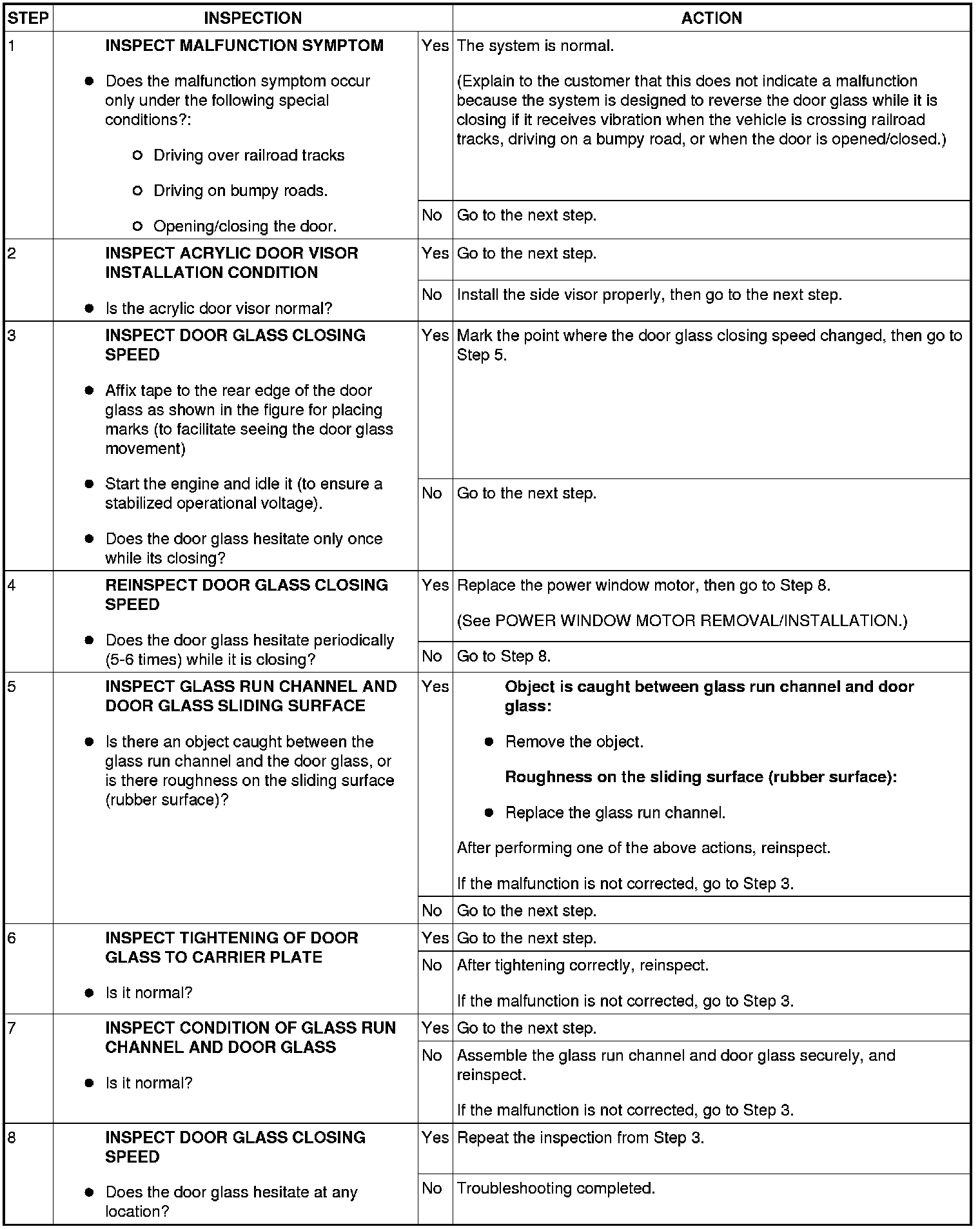 - Perform the following inspection for the power window system component parts of windows where the door glass reverses even though the glass does not encounter a foreign object while it is moving up in automatic mode.