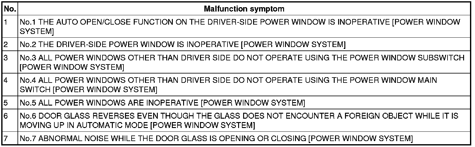 SYMPTOM TROUBLESHOOTING CHART [POWER WINDOW SYSTEM]